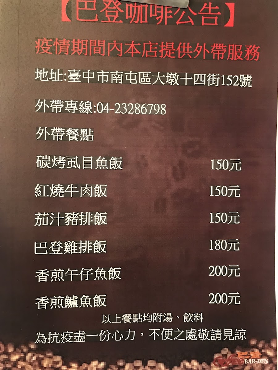 Welcome to 巴登咖啡 Bar-Den, a cherished gem in the heart of Taichung City’s Nantun District. Established over 30 years ago, this café is not only a delightful spot to indulge in quality coffee but also a comforting reminder of fond memories for many locals. The sophisticated decor, with its elegant upstairs seating area, provides a spacious and inviting atmosphere, perfect for lingering over conversation or working on your latest project.
